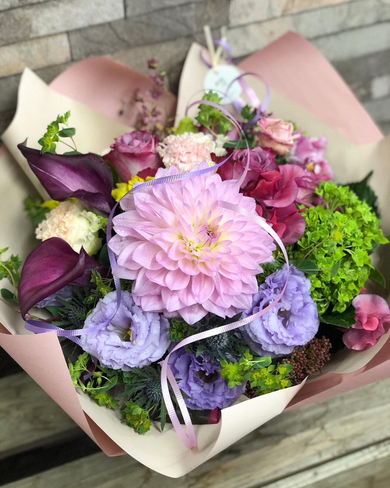 おまかせですが、当店スタッフが責任をもってお花をチョイスして可愛くラッピングしてお届けします。