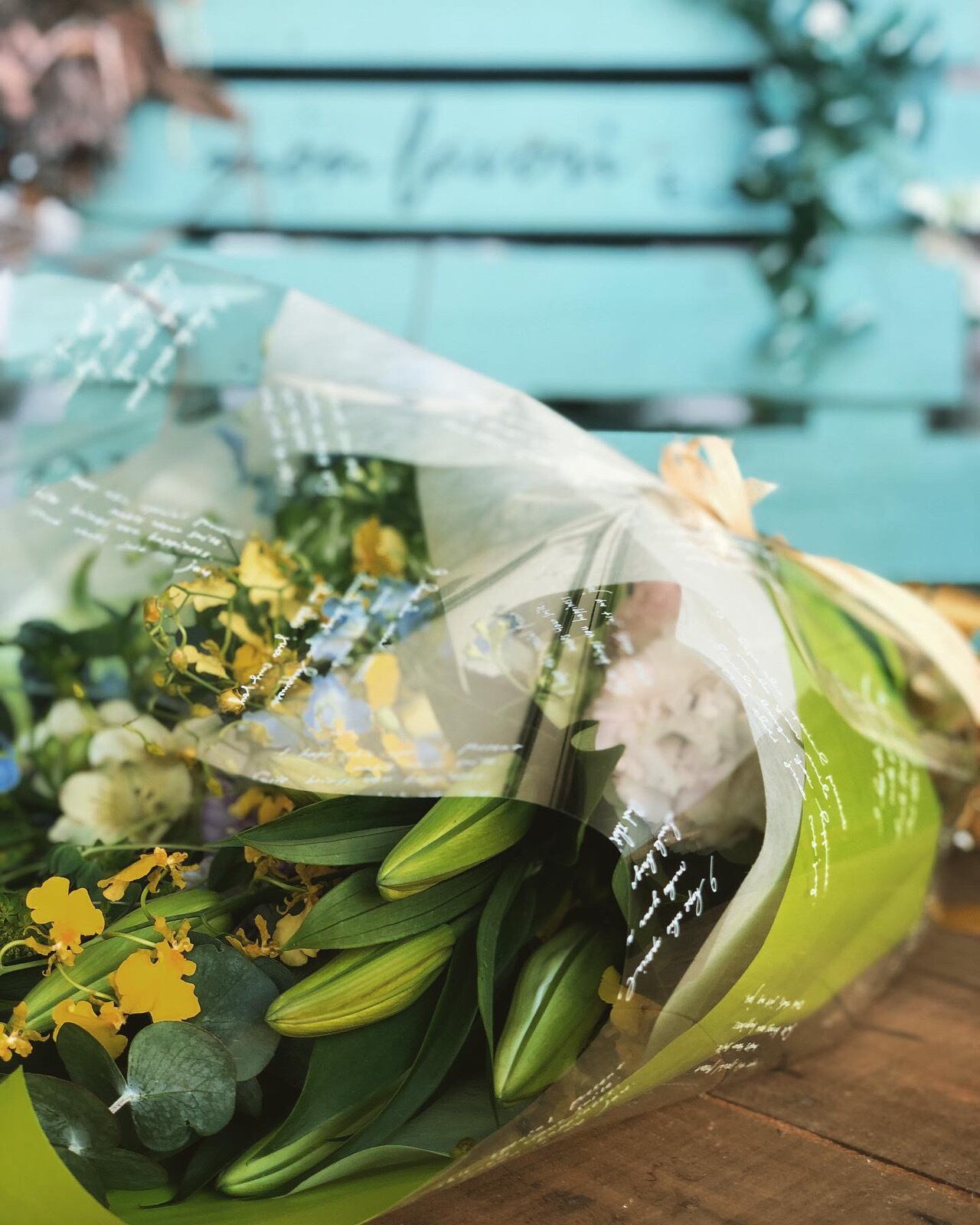 おまかせですが、当店スタッフが責任をもってお花をチョイスして可愛くラッピングしてお届けします。