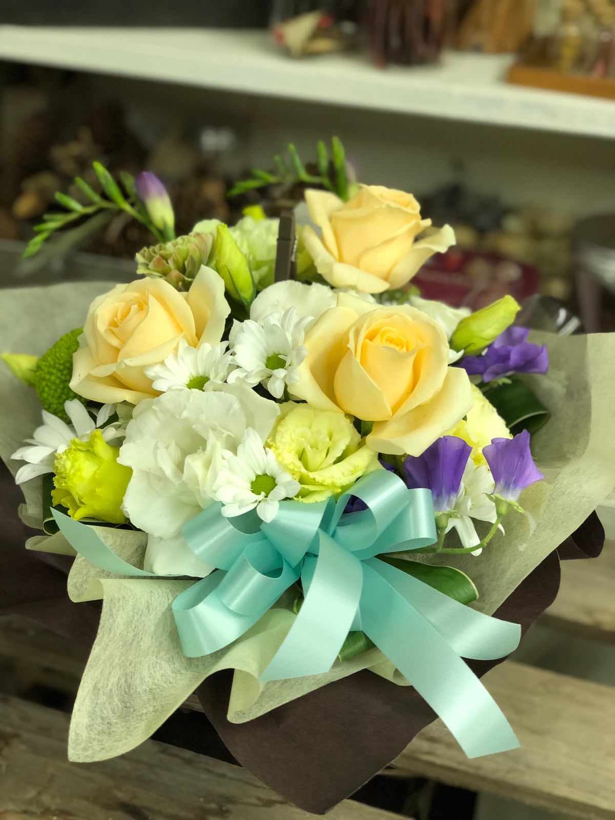 おまかせですが、当店スタッフが責任をもってお花をチョイスして可愛くラッピングしてお届けします。